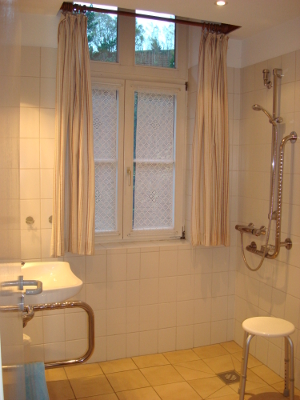 Das Badezimmer ist rollstuhlgerecht eingerichtet. Daher ist die Dusche ebenerdig.