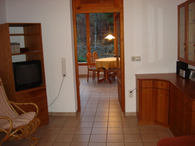 Aus dem Wohnbereich geht es durch eine Tür in den Wintergarten. Rechts sieh man noch den Schrank, links das Fernsehgerät.