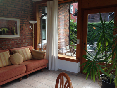 Im Wintergarten steht ein großes Sofa, das sich zu einem 2x2m grpßen Bett ausklappen lässt. Der Wintergarten hat rundum Vorhänge,