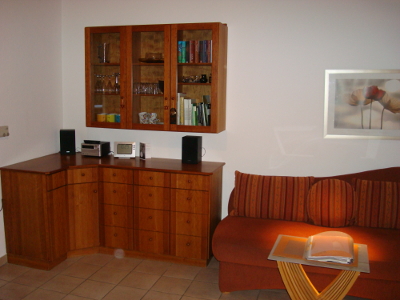 Im Wohnzimmer befindet sich neben einem Schrank mit dem Fernsehgerät (Kabel) ein weiterer mit Geschirr und Büchern neben einer Schlafcouch.